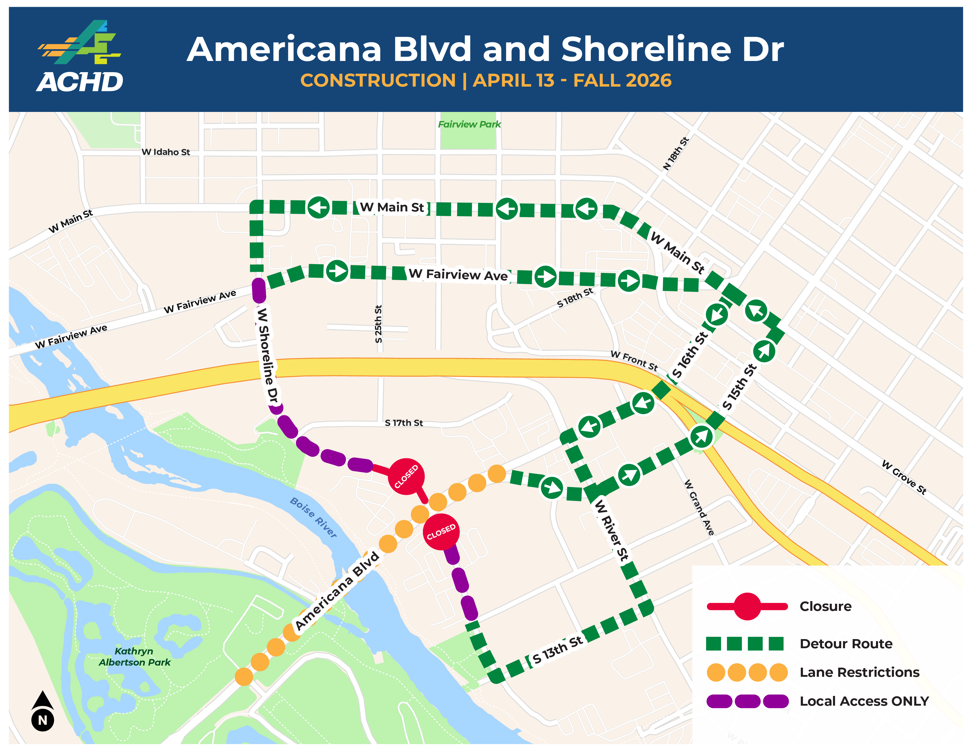 As part of the street reconstruction, ACHD will upgrade select pedestrian ramps and driveways to meet current Americans with Disabilities Act (ADA) standards. The work also includes improvements for people walking and biking, such as improved crossings and bike lane enhancements. These changes are intended to improve safety and accessibility for everyone using the street.