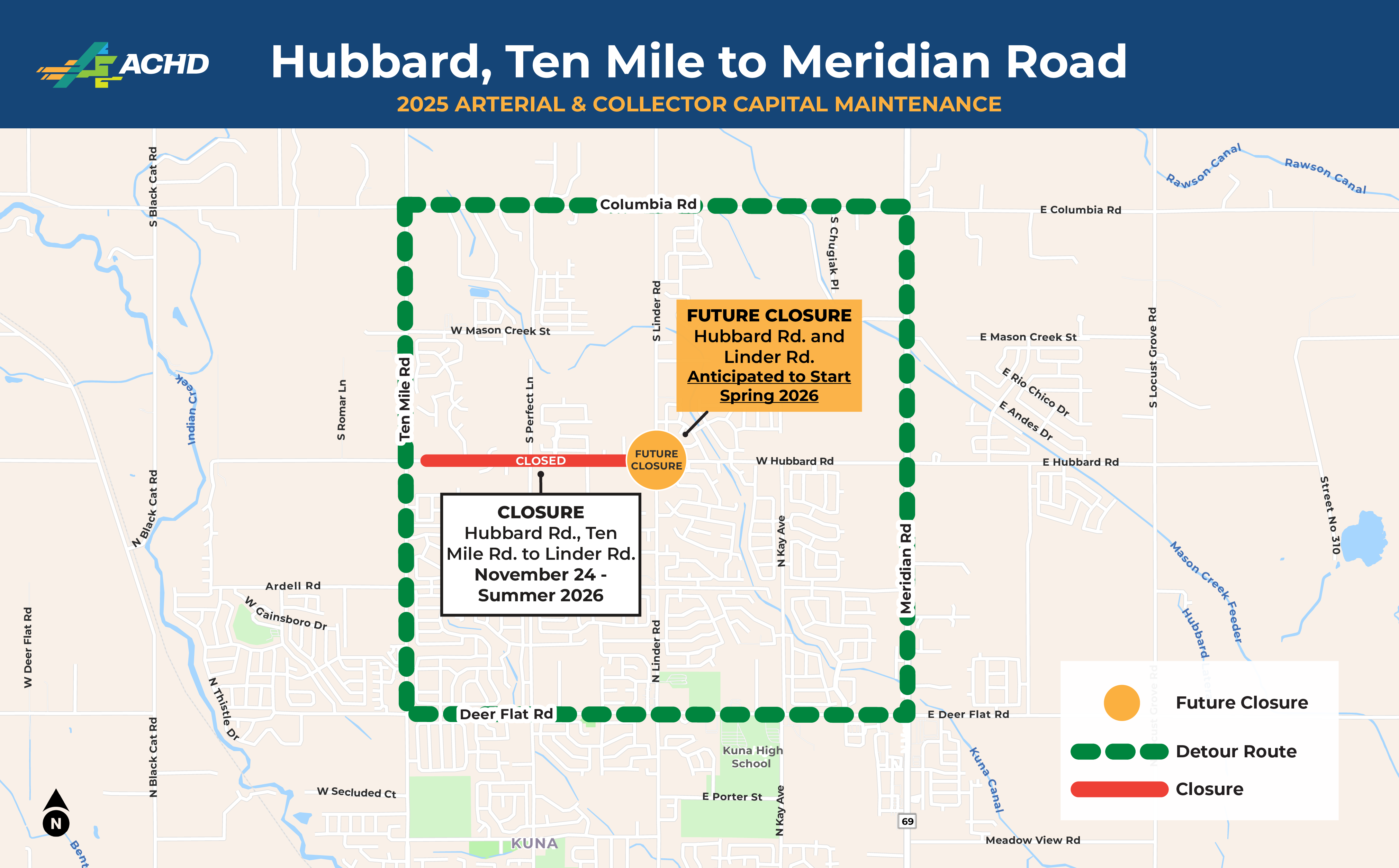 Starting as early as November, the Ada County Highway District (ACHD) will reconstruct Hubbard Road from Ten Mile Road to Meridian Road as part of the 2025 Arterial & Collector Capital Maintenance Project. Construction is expected to be complete late summer of 2026.*
